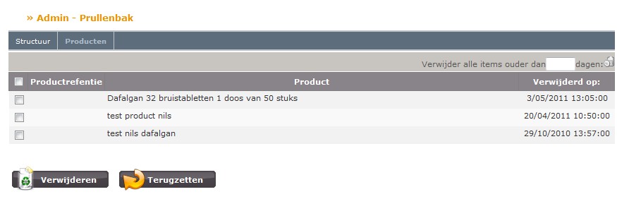 Wanneer u klikt op de "Prullenbak" kunt u alle pagina's zien die verwijderd zijn. Hierbij gaat het niet enkel om aanpassingen die aan uw eigen website zijn gebeurd maar ook om aanpassingen die op hoger niveau zijn gebeurd (bv. aan alle myPharmawebsites). Op deze laatste heeft u met uw inloggegevens geen invloed.