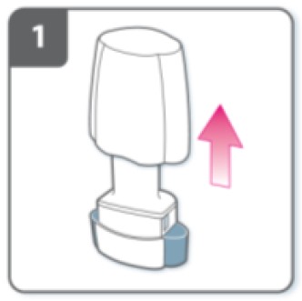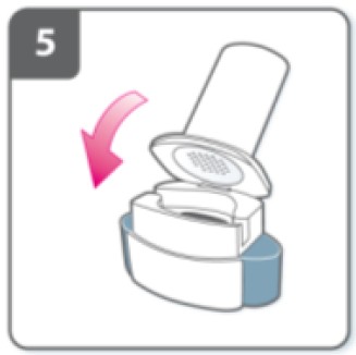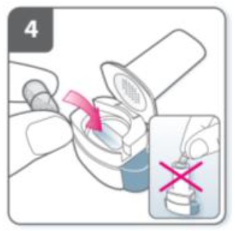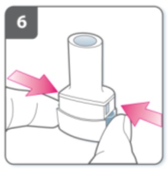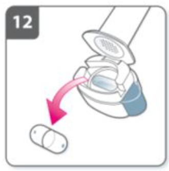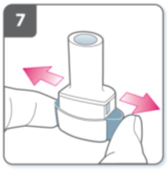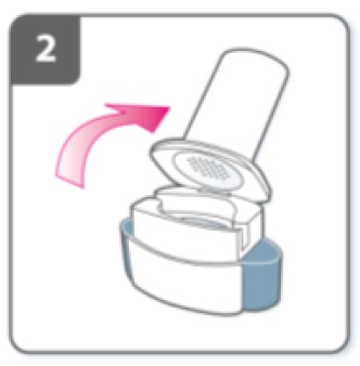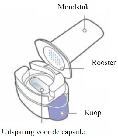 BREEZHALER:Hoe moet je de Breezhaler gebruiken?1. Verwijder de beschermkap door ze recht naar boven te trekken. Het mondstuk is nu zichtbaar.2. Houd het onderstuk stevig vast en klap het mondstuk open om de capsulekamer te openen. 3. Haal een capsule uit de bijgeleverde verpakking en plaats de capsule in de capsulekamer. 4. Sluit het mondstuk door het terug naar beneden te klappen. Als je een 'klik' hoort is het gesloten.5. Houd het toestel rechtop met het mondstuk naar boven gericht. Druk de 2 knoppen aan de zijkant volledig en gelijktijdig in. Laat vervolgens de knoppen weer los. In de capsule zijn nu gaatjes gemaakt waardoor het poeder kan vrijkomen bij het inhaleren. 6. Adem volledig uit weg van het toestel.