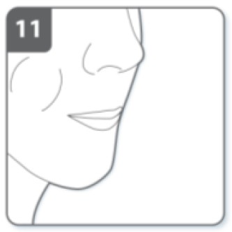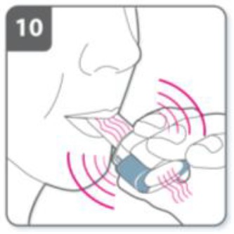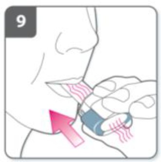 7. Zet het toestel aan de mond en omsluit het mondstuk met de lippen.8. Adem zo krachtig en zo diep mogelijk in langs de mond. 9. Haal het toestel uit de mond en houd de adem nog 5-10 tellen in.10. Herhaal nogmaals stap 6 tot 9.11. Draai het mondstuk opnieuw open zodat de capsulekamer zichtbaar is. Als je merkt dat de capsule nog niet leeg is herhaal dan stap 6-9. Is de capsule leeg, gooi deze dan bij het afval.12. Sluit het mondstuk terug en breng de beschermkap aan.Reinigen:Een keer per week moet de Breezhaler gereinigd worden.- Veeg het mondstuk met een schoon, droog en pluisvrije doek. - De Breezhaler NIET wassen met water. Bewaren:- Bewaar de Breezhaler en de blisters op een droge en koele plaats.Opmerkingen:- De capsules nooit zo inslikken!- Neem enkel de capsule uit de blister die je nodig hebt.- Het kan geen kwaad als er kleine stukjes van de capsulewand in de keel terecht komen. - Gebruik steeds het nieuw bijgeleverde toestel als je aan een nieuw doosje begint.